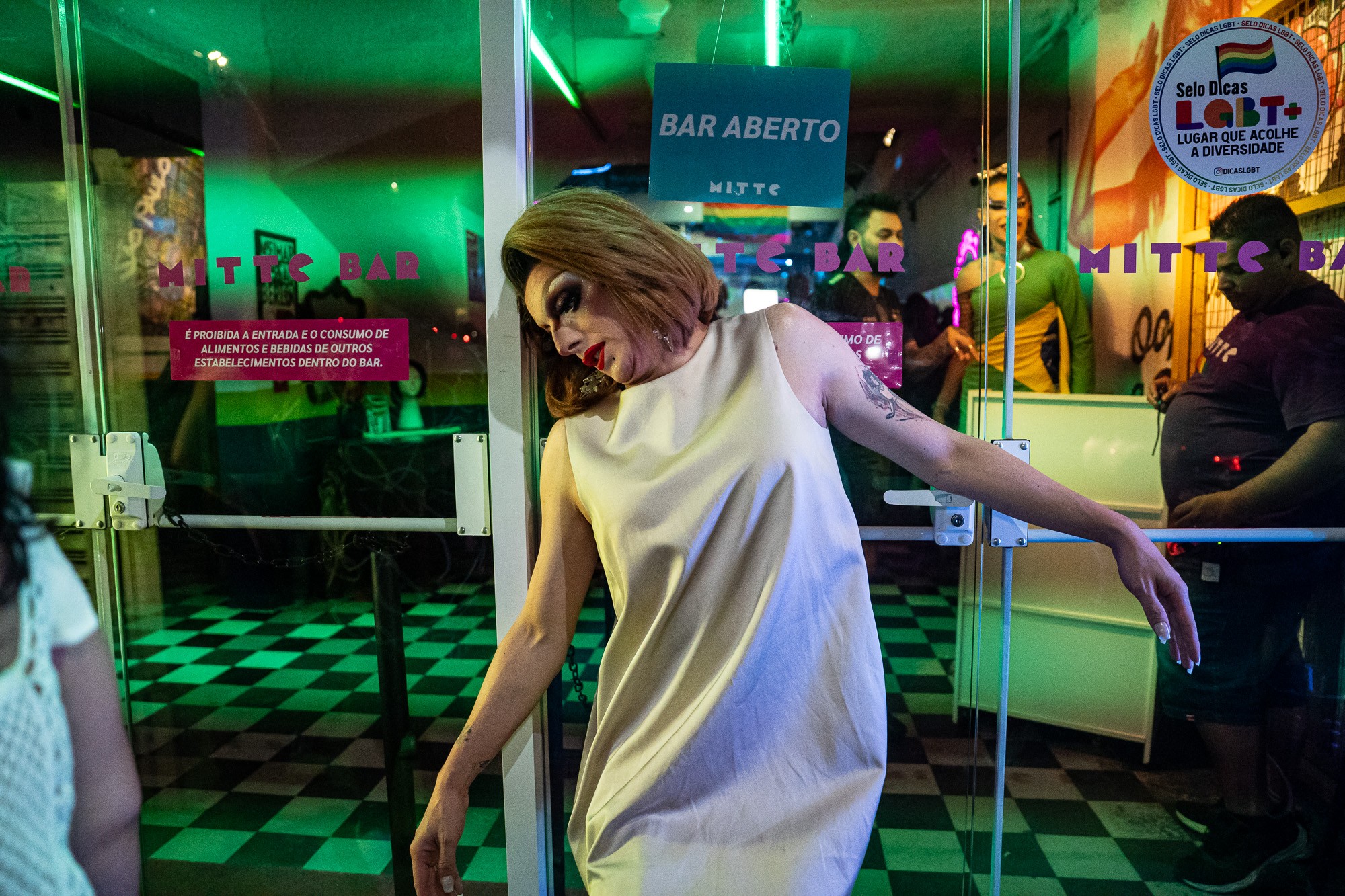 Drag queen caracterizada como Odete Roitman encena a morte da personagem diante do Mitte, bar no Centro de São Paulo, antes da exibição do capítulo final de 'Vale Tudo'. Bar ficou lotado para assistir ao desfecho da novela